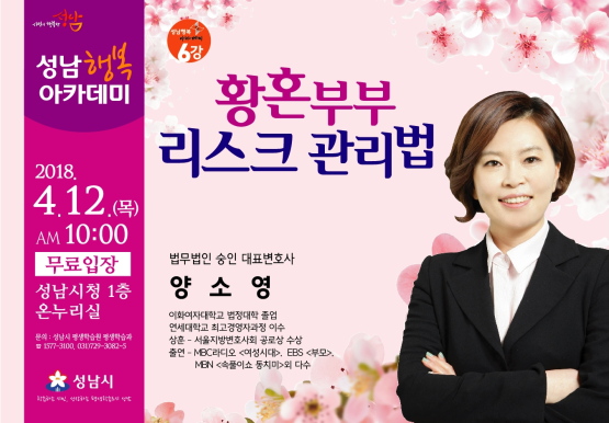 성남시는 가정법률전문 양소영 변호사를 초빙해 오는 4월 12일 오전 10시 시청 온누리에서 성남행복아카데미 여섯 번째 강연을 연다.