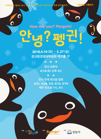 성남시는 4월 25일 '세계 펭귄의 날'을 기념하여 「안녕? 펭귄!」 전시회를 4월 10일(화)부터 ~ 5월 27일(일)까지 판교환경생태학습원에서 진행한다.