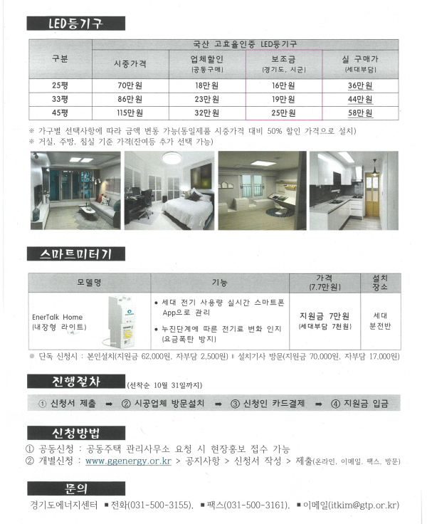 이 사업은 가전기기의 전기 사용량을 스마트폰 앱으로 알려줘 누진세 등을 인지·관리하게 하는 스마트미터기 설치와 고효율 LED 조명 교체를 지원한다.