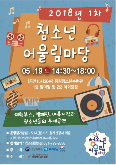 성남시청소년재단 중원청소년수련관은 오는 19일 중원청소년수련관 앞마당에서 2018. 1차 청소년어울림마당을 개최한다.