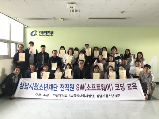 전직원 180명을 대상으로 금년 8월까지 3기에 걸쳐 진행 될 이번 코딩교육은 지난 2017년 11월 성남시청소년재단과 가천대학교 SW중심대학사업단(단장 김원)의 업무협약 체결을 토대로 청소년지도의 일선에 있는 지도자들의 창의∙융합적 사고 역량의 향상을 위하여 기획되었으며, SW교육의 기초와 더불어 컴퓨터적 사고 능력 교육, 스크래치 코딩, 브릭코딩, 드론 실습 등 실질적인 체험교육으로 구성되어 진행되었다.
