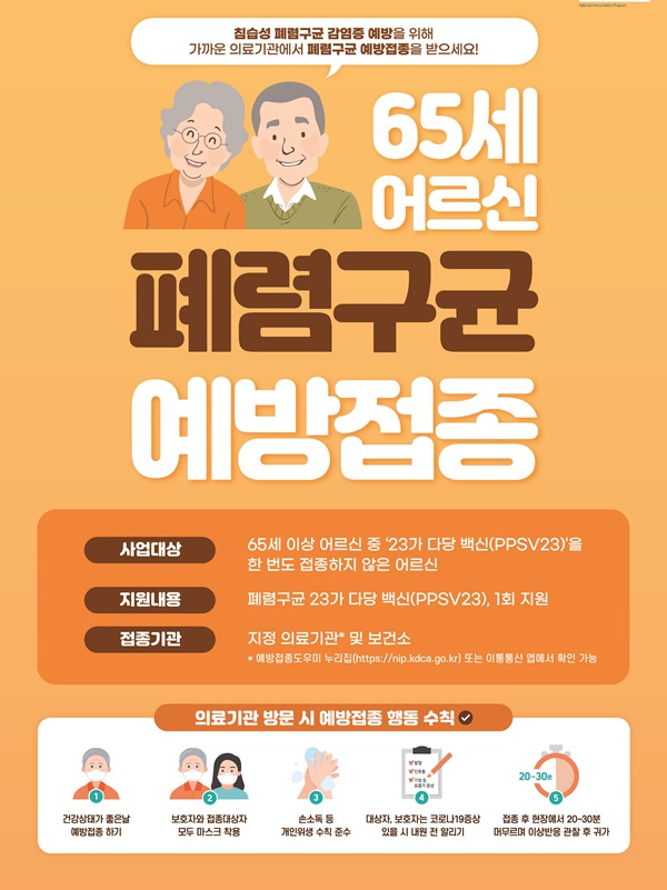 65세 이상 연령층에서 평생 1회 폐렴구균 예방접종만으로도 합병증을 50~80%까지 예방할 수 있다.
