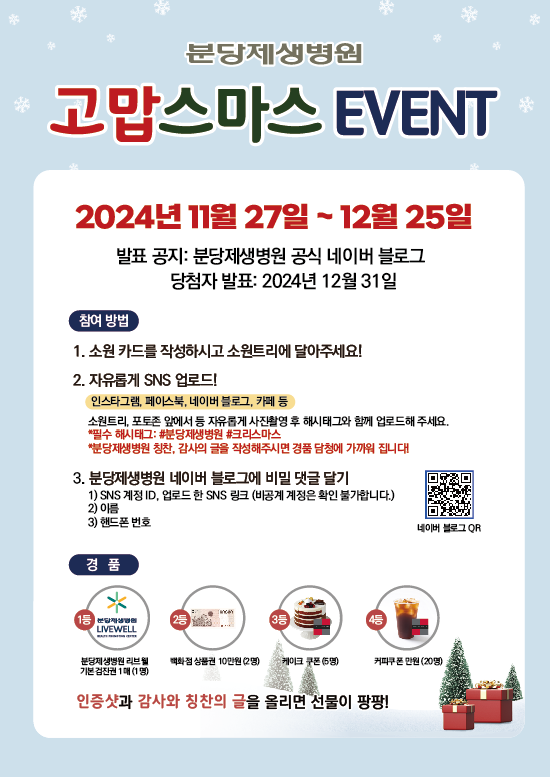 한편, 분당제생병원 2024 고맙스마스 이벤트는 11월27일부터 12월25일까지 진행되고, 당첨자 발표는 12월31일 병원 공식블로그를 통해 이뤄질 예정이다.