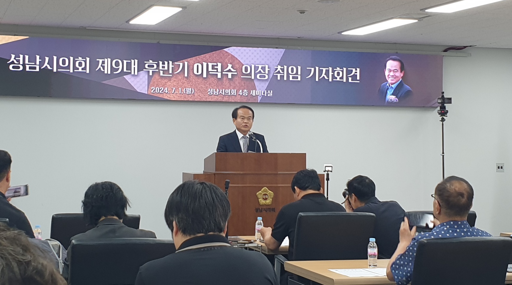 이덕수 성남시의회 의장은 7월 1일 제9대 후반기 의장 취임 기자회견에서 '성남·광주 통합시' 재추진을 선언했다,