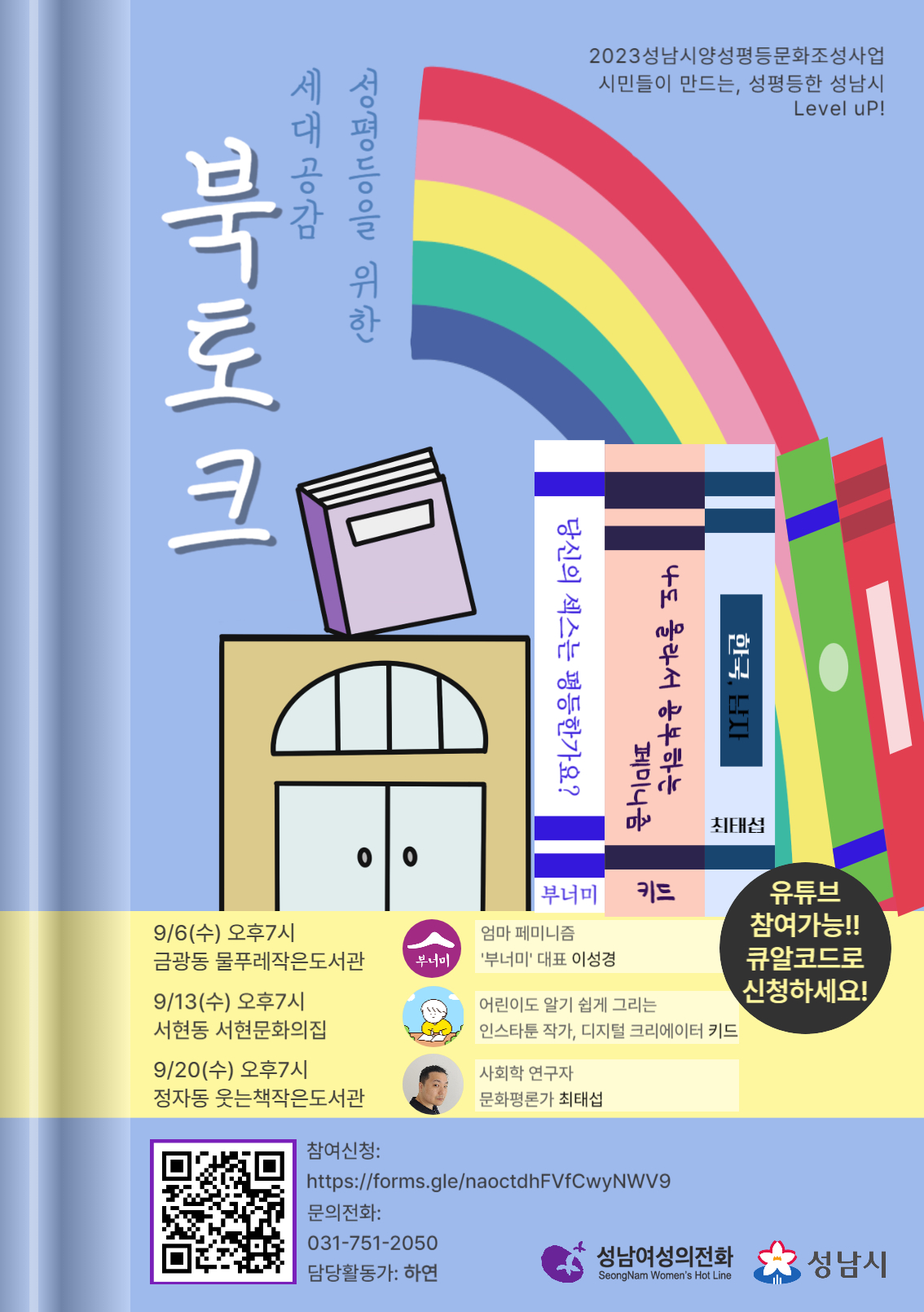 성남여성의전화에서 2023 성남시 양성평등문화조성사업의 일환으로 '성평등을 위한 세대공감 북토크'를 개최합니다.