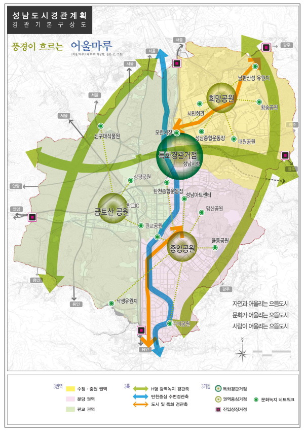 특히, 성남의 정체성(Identity)을 나타내는 랜드마크인 성남시청, 모란시장 등을 시중심부를 특화경관 거점으로 하고, 희망대공원, 중앙공원, 판교공원 3곳을 거점으로 하는 전통, 예술, 학문문화 네트워크 조화를 추진한다.