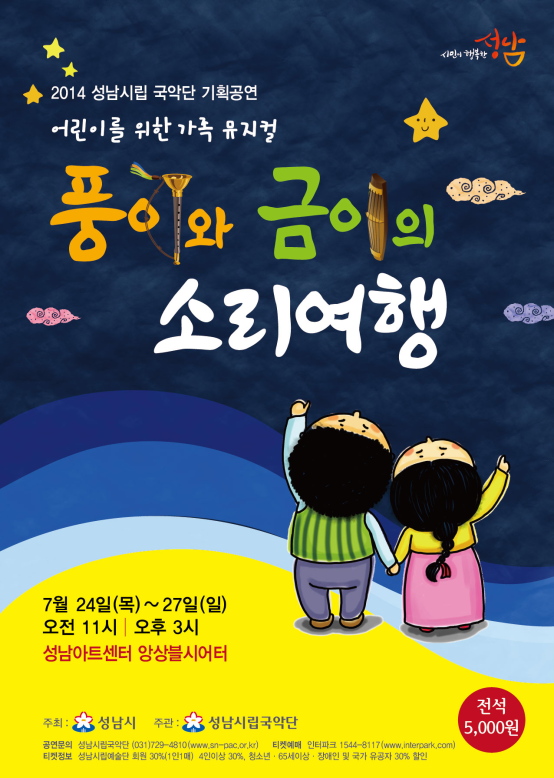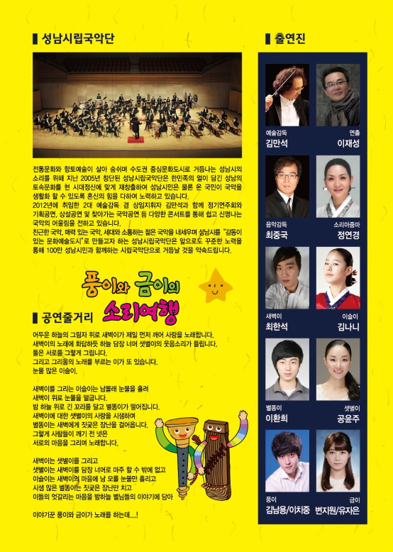 성남시립국악단「감독겸 상임지휘자 김만석」은 여름방학 특별공연으로 미래 주역이 되는 어린이들을 위한 가족뮤지컬 “풍이와 금이의 소리여행”을 공연한다.
