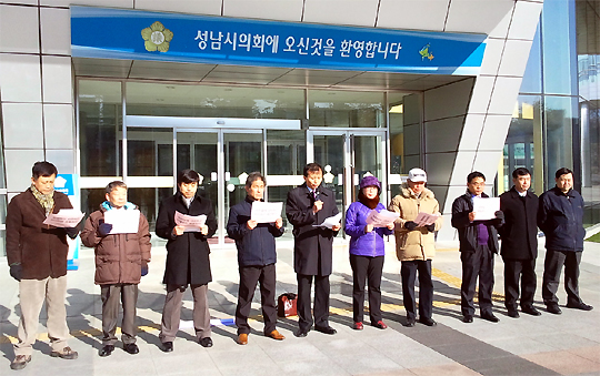 26일 오전 성남참여자치시민연대(공동대표 조희태·서덕석·최정자)는 성남시의회 현관 앞에서 기자회견을 갖고 성남시의회 한나라당협의회의 행태를 비판하고 성남시 집행부가 정치력을 발휘할 것을 촉구했다.