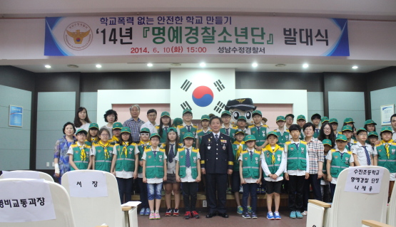 성남수정경찰서(총경 박형준)는 6월 10일 오후3시 경찰서 5층 수정마루에서 경찰서장, 각 과장, 청소년육성회장, 학교장, 양지청소년문화의집, 어머니폴리스, 학부모폴리스, 명예경찰소년단 지도교사 소년단원 등 총84명이 참석해 명예경찰소년단 발대식을 개최했다.