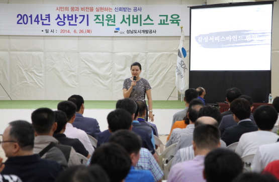 성남도시개발공사(사장 황무성)는 대민행정 직원들의 고객감동 행정문화 정착을 위해 26일 탄천운동장 이벤트 홀에서「2014년 상반기 직원 서비스 교육」을 2차에 걸쳐 실시했다.