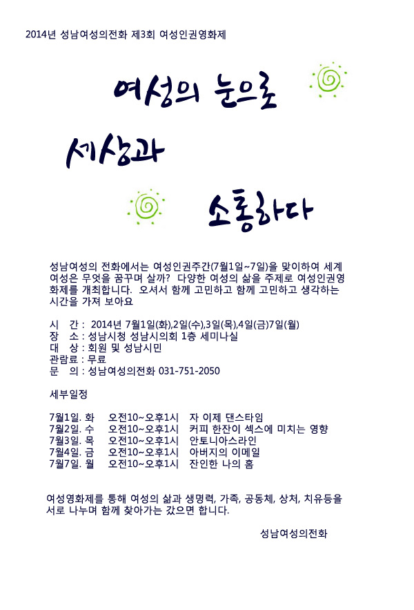 2014 여성인권영화제 개최 페이지 정보 작성자 작성일 14-06-26 20:20 본문 김영철 chul520@hanmail.net 목록 이전글성남FC 아카데미 U-10A팀, GK 공개 테스트 실시 14.06.26 다음글성남도시개발공사, 직원 서비스 교육을 통한 고객 신뢰회복 다짐 14.06.26