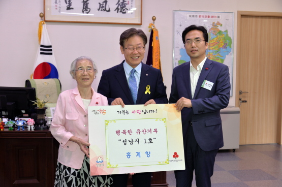 성남시와 경기사회복지공동모금회는 유산기부 공증절차(6.20)에 이어 6월 30일 오후 2시 시장 집무실에서 ‘홍계향 어르신 유산 기부식’을 진행해 감사의 뜻을 표했다.