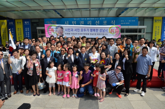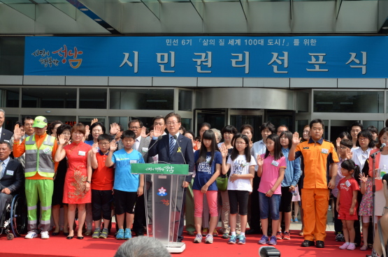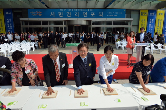 이재명 성남시장은 출근 후 오전 10시 시청 광장에서 400여명 시민과 함께 ‘시민 권리 선언식'을 했다. 시민 권리 선언문은 안전·건강·교육·삶터·경제·문화예술·아이 어르신·일자리·참여 자치·도시 미래 등 10개 분야의 내용을 담고 있다. 시민과의 약속을 상징하는 ‘시민 손도장 찍기’ 이벤트도 가졌다.