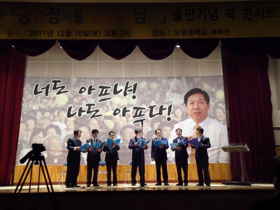 1부 출판기념 행사는 한명숙 전총리의 축사와 축하공연, 영상상연 등이, 2부 북콘서트 행사는 '공감 정치 남자'주제로 게스트에 조국 서울대 법학전문대학원 교수, 김민전 경희대교수, 노정열 코미디언과 오연호 오마이뉴스 대표의 사회로 감동과 재미를 선사했다.