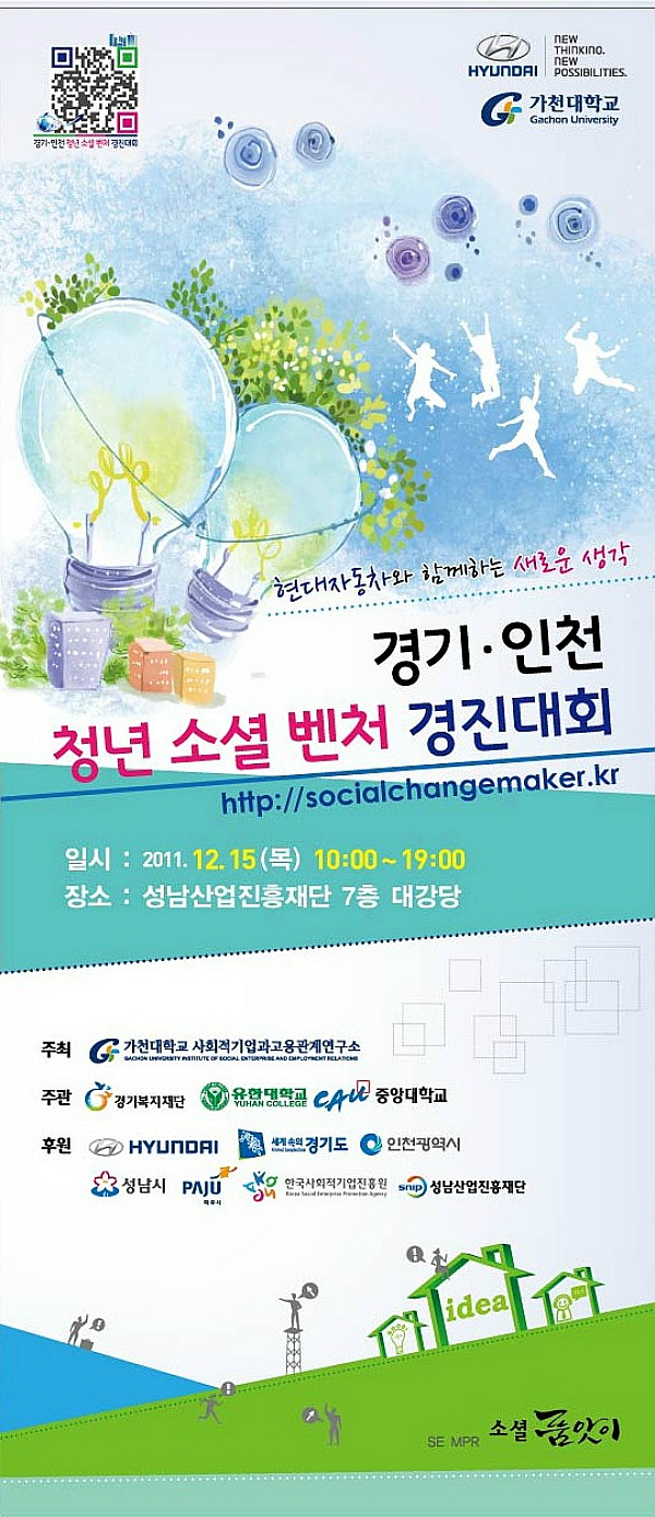 사회적기업의 새로운 전형을 만들어 나가는 경기.인천지역 청년 창업팀의 창업 의욕을 붇돋고 성공적 사회적기업 창업을 유도하기 위하여 현대자동차의 후원으로 가천대가 주관이 되어 청년창업팀의 성공가능성, 추진 경과 등을 종합 심사하여 포상한다.