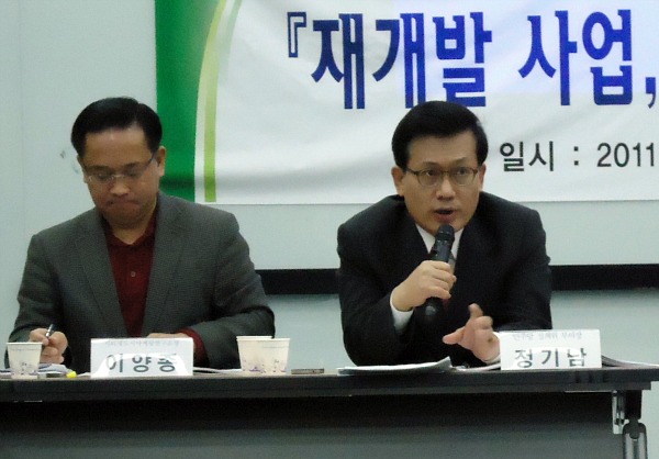 ▲성남시민사회포럼 정기남 공동대표가 1일(목) 성남시청 율동관에서 재개발 정책토론회 토론발표를 하고 있다.