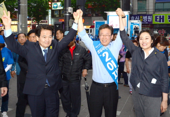 이재명 성남시장 후보 선거지원을 나선 새정치민주연합 정동영 상임고문과 박영선 원내대표는 이날 오후 7시께 구 성남시청 앞 광장을 방문해 유권자들에게 공약이행률 94%의 책임정치 및 반부패경쟁력 경기도1위의 청렴정치 표본인 이 후보를 적극 지지했다.