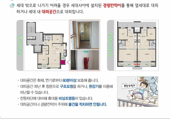 성남시는 아파트에서 불이 났을 때 세대 간 발코니 경계벽에 설치된 ‘경량칸막이’를 부수고 탈출하거나 그밖에 세대 내 비상 대피공간을 통해 탈출하는 법을 주민들에게 적극 홍보하고 나섰다.