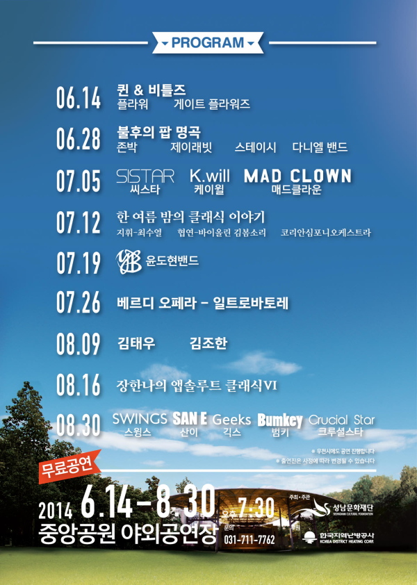 6월 14일(토) 오후 7시 30분에 열리는 <파크 콘서트>의 첫 무대는 TV프로그램 ‘탑밴드’에서 크게 이름을 알린<게이트 플라워즈>, 인기 록그룹 <플라워>가 ‘퀸&비틀즈’라는 타이틀로 첫 무대를 화려하게 열 예정이다. 6월 28일에는 존박, 제이래빗 등이 출연하여 불후의 팝 명곡을 선사하고, 7월 5일에는 최고의 걸그룹인 <씨스타>와 <케이윌>이 출연 주말 저녁, 중앙공원을 뜨겁게 달군다.