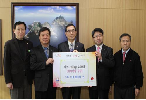 (주)대원버스는 직원 450명 규모의 성남시내·외를 운행하는 운수업체로 2011년부터 성남시 저소득층에게 명절시마다 사랑의 쌀을 정기 기탁해오고 있으며 금번 설에는 20kg 200포를 기탁하였다.