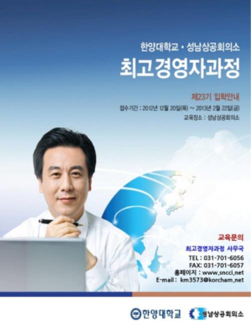 성남상공회의소(회장 변봉덕)는 한양대학교와 공동으로 최고경영자들에게 글로벌 시대의 새로운 변화에 능동적으로 대처할 수 있는 판단력과 지도력을 증진시키고자 하는 목적으로 제23기 최고경영자과정 수강생을 모집 하고 있다.