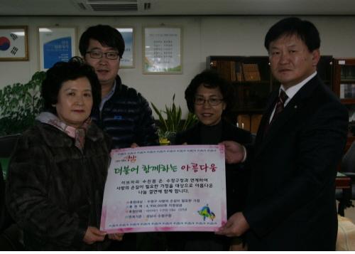 이브자리 수진점(대표 김인남)은 지역사회에 뜻있는 일을 찾다 성남시에 거주 하면서 도움이 필요한 분들에게 따뜻한 사랑의 손길을 주고자 2005년 부터 매년 겨울이 시작되는 12월에 이불을 제공하게 된 것이 어느듯 2012년 현재까지 8년동안 기부하게 되었다.