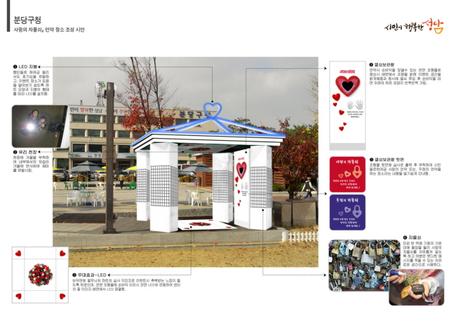 '사랑의 자물쇠‘로 이름 붙인 언약식 장소는 기존 휴식공간을 리모델링해 지붕에 이벤트 장소임을 알리는 하트모양 조명등을 설치하고, 4개 기둥에 언약한 내용을 새 긴 자물통을 잠가 걸어놓을 수 있는 철망을 둘렀다.