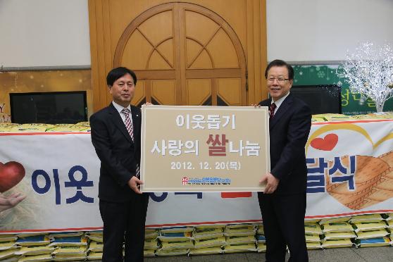 분당구 정자동에 위치한 여의도순복음분당교회(담임목사 이태근)에서는 연말연시를 맞이하여 어려운 이웃과 따뜻한 마음을 나누고자 2012. 12. 20(목) 분당구 저소득가정에 백미(10㎏) 700포를 기탁하였다.