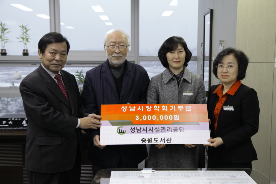 성남시시설관리공단(이사장 이상락)에서 운영하는 중원도서관은 정부로부터 우수기관선정(국무총리상)으로 받은 포상금 전액을 지역사회 발전과 후학양성을 위해 지난 13일 성남장학회(이사장 주수광)에 기부했다.