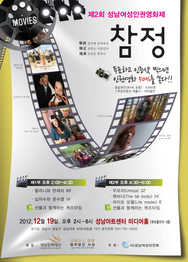 성남여성인권영화제 페이지 정보 작성자 작성일 12-12-17 15:28 본문 ■ 종일권 9,000원(투표인증샷 제출시 50%할인)입니다. 김영철 chul520@hanmail.net 목록 이전글성남시 '청소년이 행복한 만들기' 앞장서 12.12.18 다음글판교공원 마당바위 해맞이 행사 12.12.17