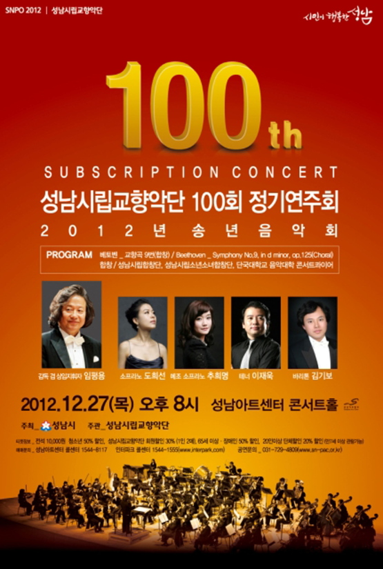 ‘2012년 송년음악회’이기도한 이번 연주회에서 성남시립교향악단은 “베토벤 예술의 최고 정점”이며 “동서고금을 통해 독보적인 걸작”으로 손꼽히는 베토벤의 마지막 교향곡 9번 합창교향곡(L.v.Beethoven / Symphony No.9, in D minor, Op.125) 전곡을 연주한다.