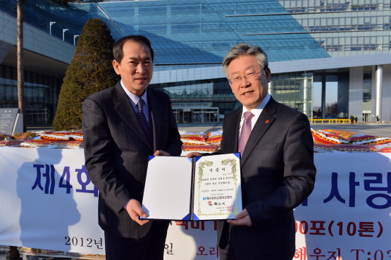 성남시는 12월 24일 오후 3시 30분 시청 광장에서 김진원 해우지 음식점 대표와 성남시 관계 공무원 등 5명이 참석한 가운데 ‘사랑의 쌀 전달식’을 가졌다.