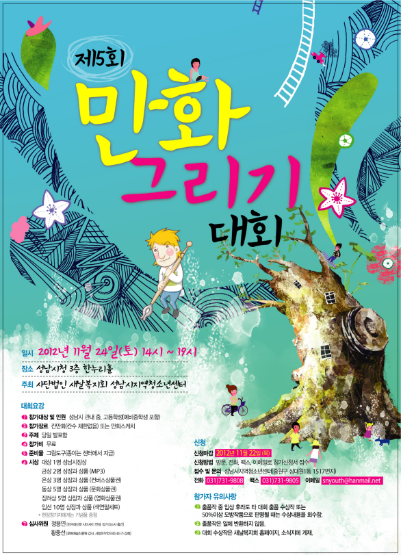 성남시지역청소년센터는 성남시 관내 청소년 만화동아리와 만화에 관심이 있는 청소년들이 만화그리기 대회를 통해 실력을 발휘하고 창작력을 증진시키며, 시사적인 주제를 통해 사회를 보는 눈을 키울 수 있는 계기를 마련하고자 '제 5회 만화그리기대회'를 개최한다.