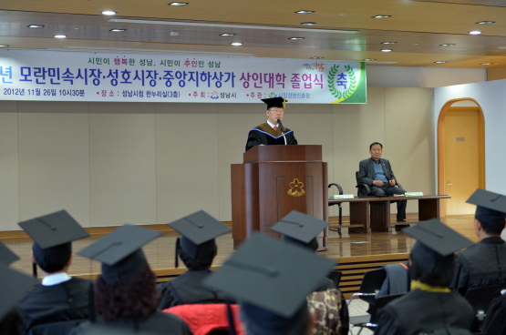 성남시가 장기간의 경기침체와 유통환경 변화 등으로 어려움을 겪고있는 전통시장 상인들의 경쟁력 향상을 위하여 실시한 2012 하반기 상인대학이 11.26(월) 10:30 성남시청 한누리실에서 이재명 성남시장과 200여명의 상인(졸업생 177명)이 참석한 가운데 개최된다.