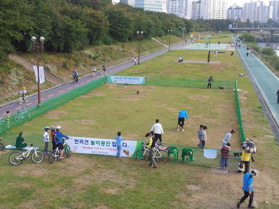 앞선 지난달 24일 성남시는 야탑동 코리아디자인센터 앞 탄천에 375㎡규모의 울타리를 두른 반려견 놀이공간을 마련해 시민호응을 얻고 있다.
