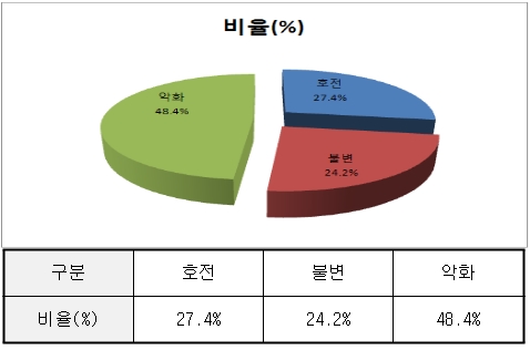 자금 사정을 묻는 질문에 호전 17.7%, 불변이 53.2%, 악화가 29.1%로 응답하였다. 응답한 대다수 기업들은 금년도 하반기 전망에서도 호전과 불변이 각각 27.4%, 24.2%인 반면 더 악화 될 것이라고 답한 기업이 48.4%로 나타났다.