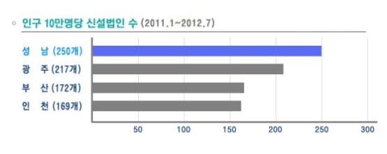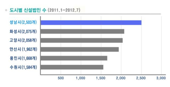 중소기업청 발표 신설법인 현황을 분석한 결과, 성남시는 2011년 1월 이후 현재까지 2,503개의 신설법인이 등록되어 수도권 내 고양(2,058개), 용인(1,668개), 수원(1,584개) 등을 여유 있게 제치고 1위에 올랐다. 매월 평균 130개 이상의 법인이 신설된 셈이다.