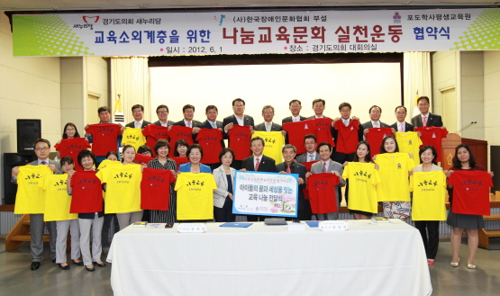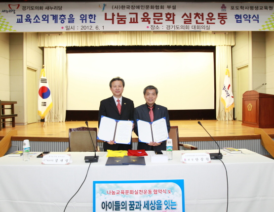 경기도 의회 새누리당(대표의원 정재영)과 (사)한국장애인협회 부설 포도학사 평생교육원(회장 안중원)는 우리사회 교육 불평등 해소를 위해 '나눔 교육문화 실천운동'을 위한 협약식을 체결하고 100명에게 나눔교육카드 및 후원품 전달식을 6월 1일 경기도의회 대회의실에서 개최하였다.