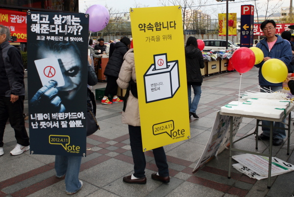 이들은 이날 낮 시간대에 율동공원에서 캠페인을 진행했으며, 9일 저녁 7시경에는 야탑역 광장에서 투표참여 캠페인을 계속해서 이어나갈 예정이다.