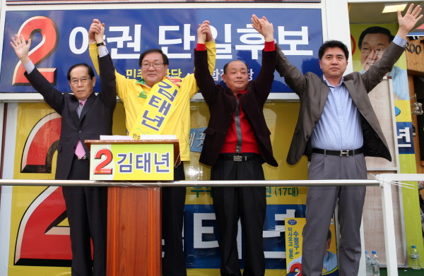 아울러 김 후보는 “이명박 대통령과 새누리당 정권이 잘했다고 생각하시면 1번을 선택하시라. 잘 했으면 또 밀어줘야한다. 하지만 ‘못했다. 이제 그만해야한다. 못해도 한참 못했다’고 생각하신다면 바꿔줘야 되는 것 아니겠느냐?”고 반문하면서 “이명박 정권을 바꾸려면 기호2번 김태년을 선택하셔야한다. 저는 부족한 게 많고 모자란 것 많아 지난 4년 전 전국최소표차인 129표차로 낙선했었다. 하지만 시민들의 따뜻한 격려와 사랑을 얻어 신명나게 성남과 수정구를 위해 일해왔다. 이제 다시 수정구민들의 선택을 받아 정치 정말 멋지게 하는 국회의원 김태년으로 보답해드리겠다. 이번 총선에서 꼭 지지해달라”고 역설했다.