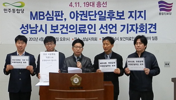 4일 성남시 개인,법인 택시노동자들과 민주노총 성남광주하남지부 소속 조합원들의 야권단일후보지지에 이어, 5일 오후1시 성남시의회 시민개방실에서 '이명박정권을 심판하는 4.11총선 야권단일후보 지지 성남시 보건의료인 선언' 기자회견을 갖었다.