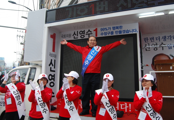 한편, 신영수후보는 공식선거기간이 시작된 당일 오후2시 30분경, 성남 수정구에 위치한 선거사무소앞에서 선거운동원, 지지자들과 함께 공식선거운동 출정식 및 첫 유세를 시작하였다.