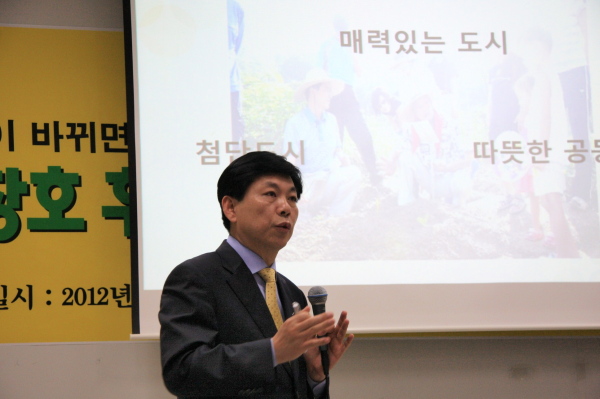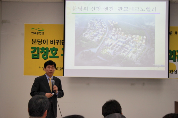 3월 27일 오전 11시 성남시의회, 민주통합당 분당갑 김창호 국회의원후보는 분당갑 지역 공약정책 발표회를 개최하면서 ‘프리젠테이션’ 방식의 새로운 형식을 도입했다. 김후보는 이날 마치 스티브잡스가 애플의 신제품을 내놓듯이 기자들을 상대로 능숙한 정책공약을 선보였다.