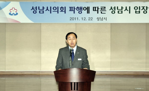 22일 오후2시 시청 한누리관에서 성남시 윤학상 홍보담당관은 "금년 최종 추경예산이 처리되지 못해 막대한 시민피해와 시정혼란이 초래되었으며, 내년 예산 또한 처리되지 못해 사상 초유의 준예산 체제로 시정이 전면 중단될 위기에 처했다"고 밝혔다.