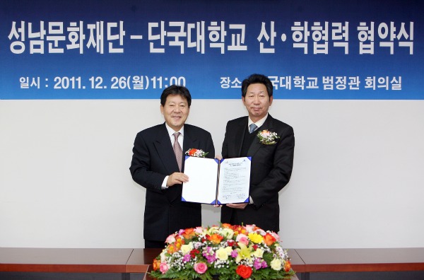성남문화재단 안인기 대표이사와 단국대학교 장호성 총장은 26일 단국대 죽전캠퍼스 범정관에서 산학협력 협약식을 갖고, 상호협력을 약속했다.
