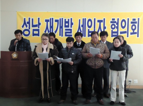 성남시재개발세입자협의회(상임대표 이영화)가 성남시의회의 예산삭감에 대해 10일 기자회견을 열고 한나라당 시의원들에게 '화합과 소통'의 의회의 모습을 보여달라고 촉구했다.