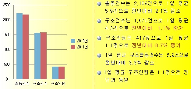 이는 2010년 대비 출동건수는 46건(2.1%) 감소했고, 구조건수는 17건(1.1%), 구조인원 3건(0.7%) 각각 증가한 것으로 집계돼 전반적으로 ‘10년과 비슷한 추세로 분석됐다.