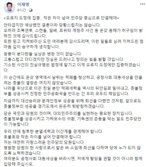 이에 SNS에 <오로지 도정에 집중.. 작은 차이 넘어 민주당 중심으로 단결해야> 제목으로 "안타깝지만 예상했던 결론이라 당황스럽지는 않다"면서, "오히려 조폭연루, 스캔들, 일베, 트위터 계정주 사건 등 온갖 음해가 허구임이 밝혀진 것에 감사드린다"고 심정을 밝혔다.