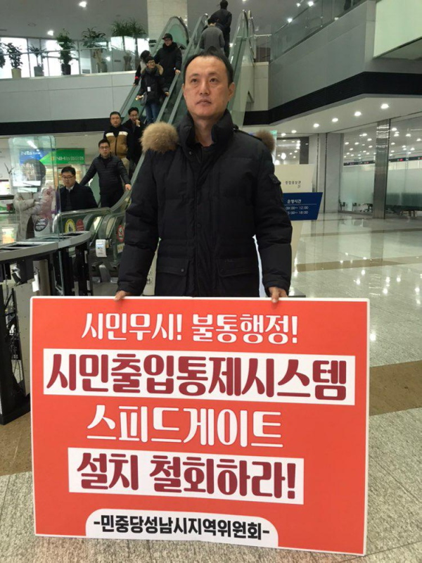 민중당 성남시지역위원회 남언호 부위원장은 11일 오후 12시경부터 1시까지 시청사 내 1층 스피드게이트 앞에서 ‘시민무시! 불통행정! 시민출입통제시스템 스피드게이트 설치 철회하라’는 내용이 담긴 피켓을 들고 1인 시위를 진행했다.