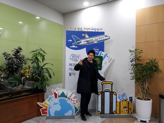 비행기와 여권, 비행기 표, 트렁크, 지구본 등으로 꾸며놓고, 시정 구호인 ‘하나 된 성남, 시민이 시장입니다’를 써 놓았다.